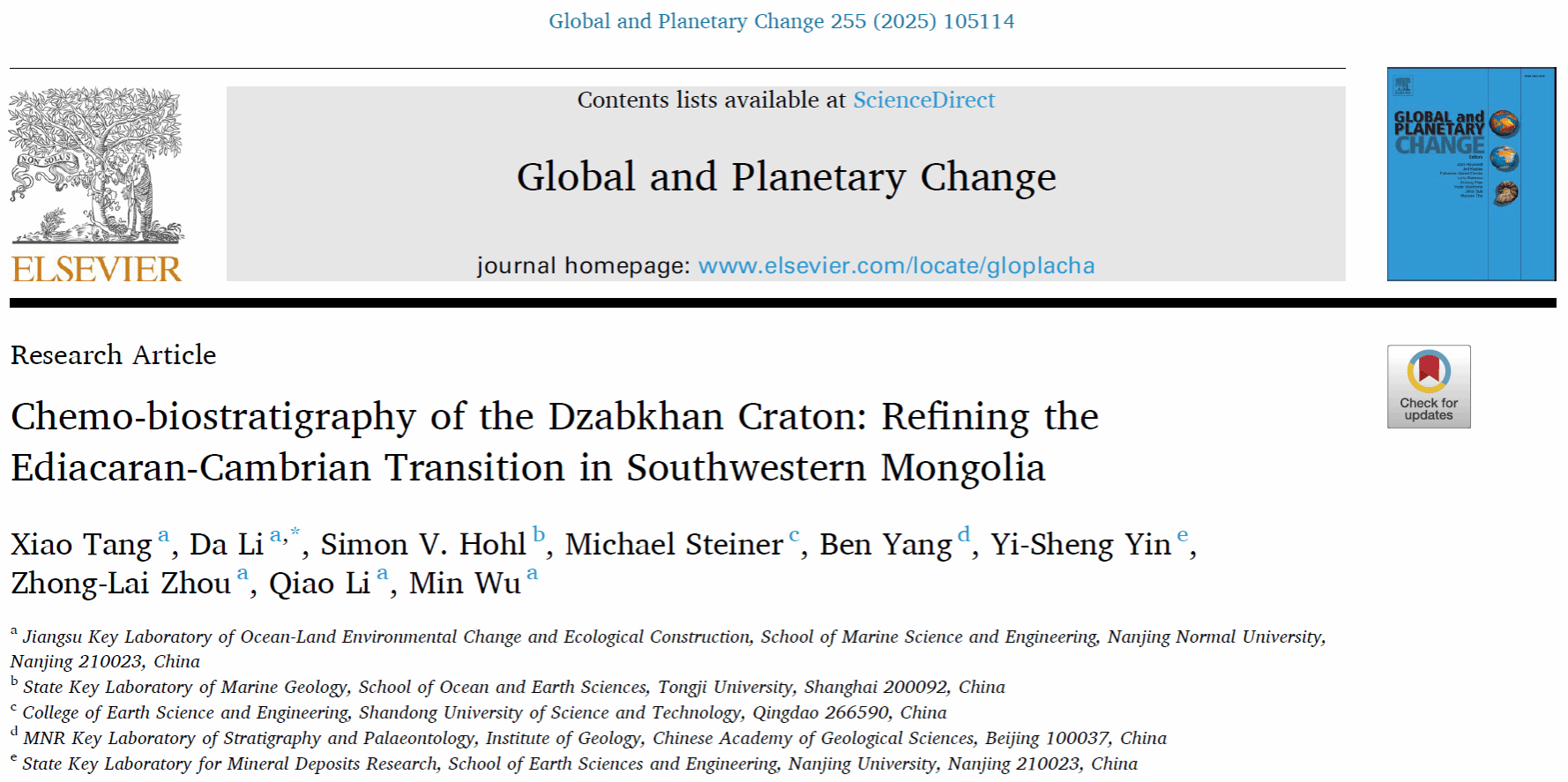 近日,南京师范大学海洋科学与工程学院、江苏省海-陆环境演变与生态建设高校重点实验室李达副教授课题组在埃迪卡拉系-寒武系化学生物地层学研究中取得重要进展。该研究对蒙古西南部Dzabkhan克拉通的埃迪卡拉系-寒武系地层进行了高分辨率化学-生物地层学分析,提出整合小壳化石首现(FAD)、碳-锶同位素地层学作为埃迪卡拉系-寒武系界线的综合辅助判定手段。相关成果以“Chemo-biostratigraphy of the Dzabkhan Craton: Refining the ...